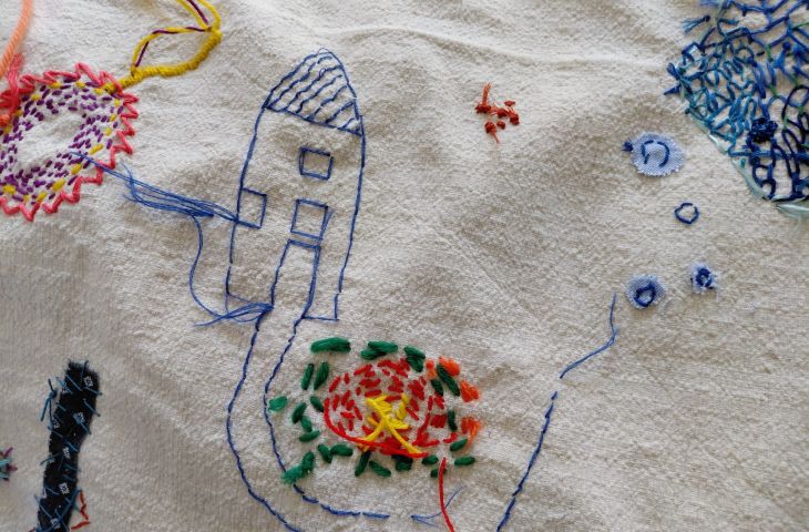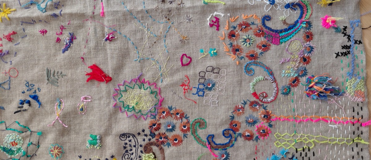 Im Winter 2025-2026 engagiert sich Nanna im dritten Semester im Recovery College Stuttgart und in der Offenen Herberge e.V. Sie vermittelt in lockerer Runde "Communal Stitching", gemeinschaftliches Sticken (Fotos unten). Im eigenen Tempo werden Spuren mit Nadel und Garn auf einen Stoffträger, ein Tischtuch, gestickt. Niemand soll sich unter Druck setzen. Neugierde und Lust zum Ausprobieren sind gut. Plötzlich klappt es wunderbar!