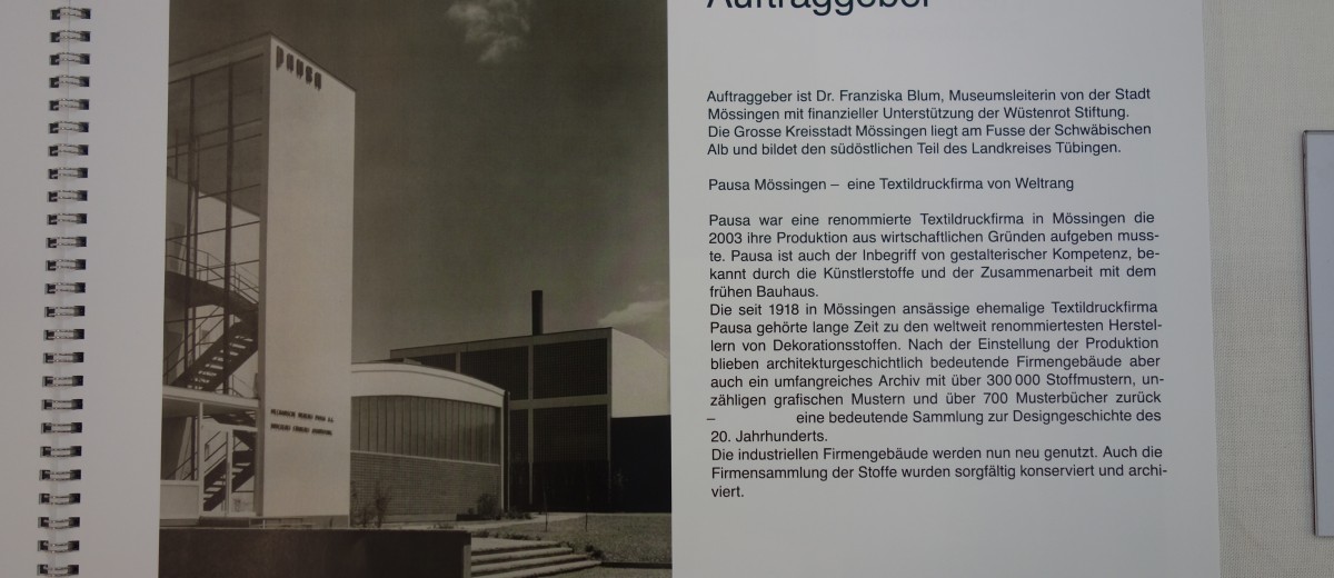 2019-2021 lief das spannende Projekt, mit Förderung der Wüstenrot Stiftung, in der ehemaligen Textildruckfirma Pausa in Mössingen (bei Tübingen). Zusammenarbeit mit der Abteilung Textildesign, Schule für Gestaltung Basel, Schweiz, und den angehenden Kunstlehrer_innen der Pädagogischen Hochschule Ludwigsburg folgten Ende 2019. Neue Designs entstanden, die auf Altem zurückgreifen. Studierende dockten an meiner Forschungsarbeit der 1950er-Jahre Entwürfe im nicht-öffentlichen Pausa-Depot in Mössingen. Ich wählte fünfzig characteristische Textilien oder Dessins aus und vermittelte diese wertvollen textilhistorischen Informationen an den motivierten Studierenden aus der Schweiz und Deutschland weiter. Ende 2020 eröffnete die geplante Ausstellung in der Pausa Tonnehalle, aber sie wurde promt "Opfer der Corona-Pandemie" und blieb geschlossen bis auf einige Tage im Februar 2021.